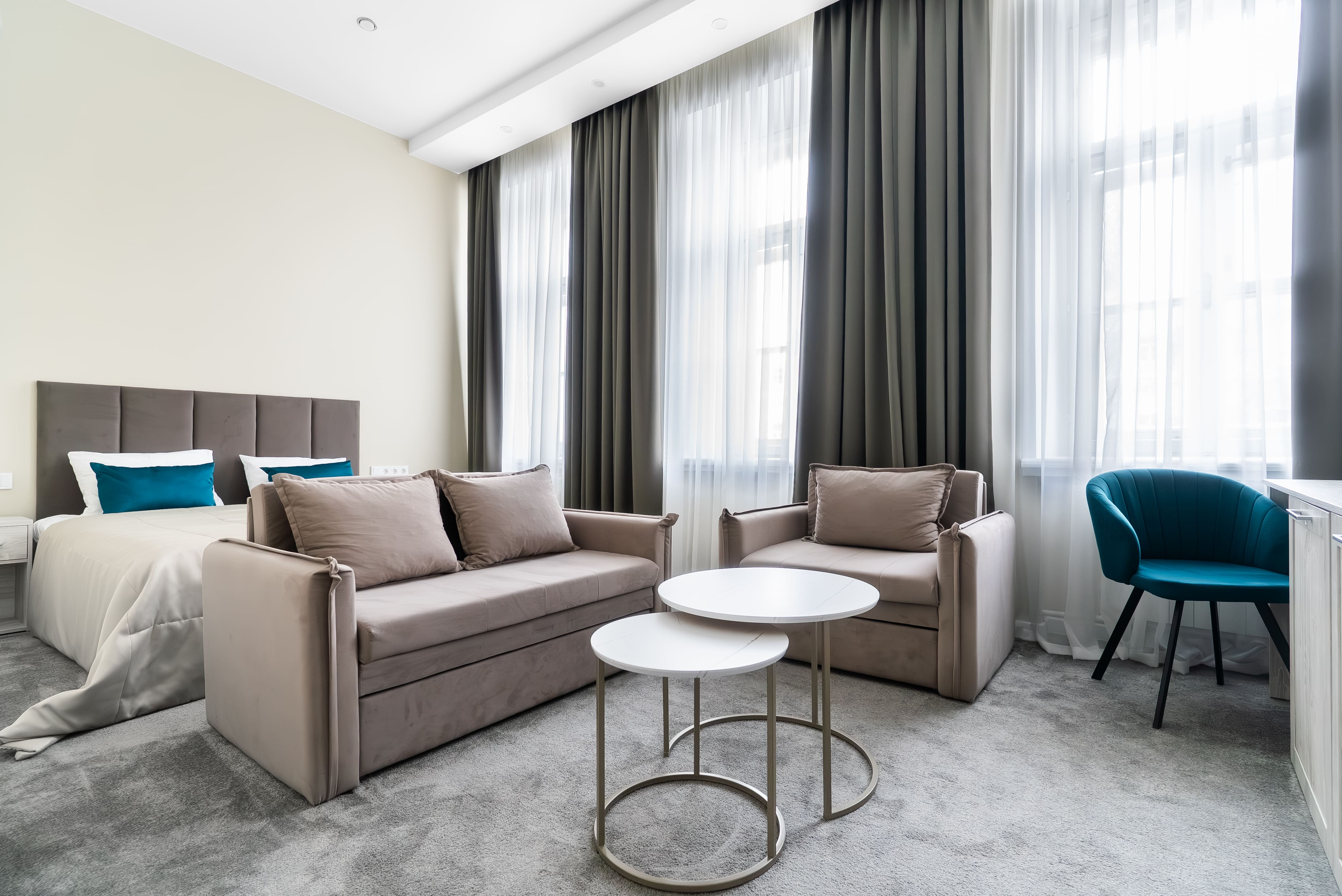 Проект, как обычно, реализован с учетом повышенных требований к износостойкости — не знаем, как у других, но для нас это база! Визуально интерьеры выполнили в светлых тонах, чтобы сохранить нейтральную и спокойную атмосферу для гостей.