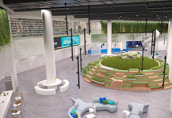 Меблировка зон павильона на ВДНХ, крупнейшем в России просветительском комплексе, посвященном истории ядерной эпохи, представляет собой целостное решение для обеспечения комфорта в зонах отдыха и развлечений.