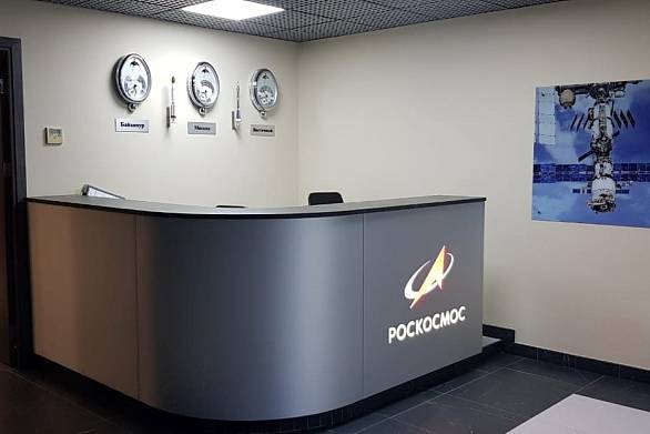 • Плавно изогнутую стойку ресепшена с логотипом РОСКОСМОС.