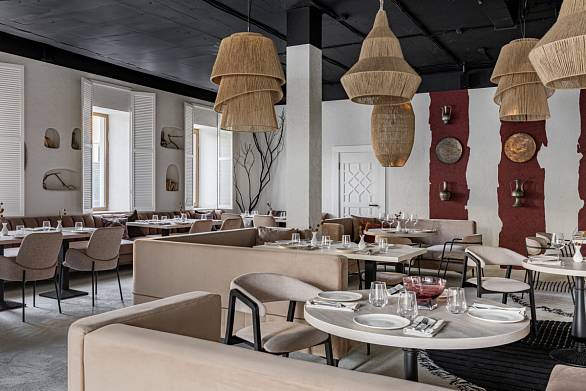 • Столы из массива дерева подчеркнули природную фактуру и связали интерьер с ремесленными традициями. Их крупные модели идеально подошли для залов с большими компаниями, а компактные - для уютных камерных зон.