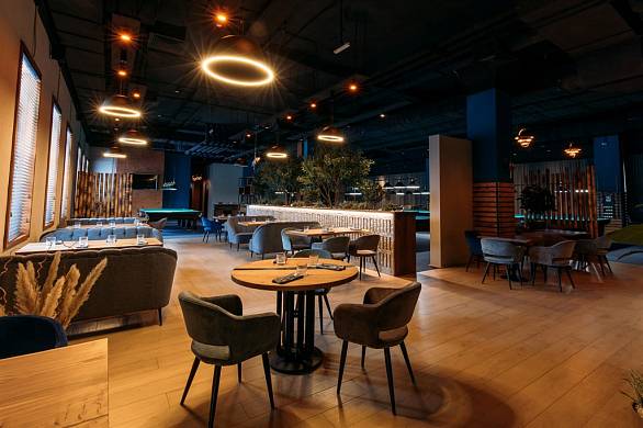 В ресторанной зоне гостей встречают компактные диваны с оригинальными округлыми спинками. Популярные полукресла и барные стулья с открытой спинкой придают пространству легкость и воздушность. Комфортные просторные диваны в игровой зоне, создают идеальное место для сосредоточенных взглядов и волнующих моментов.