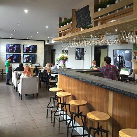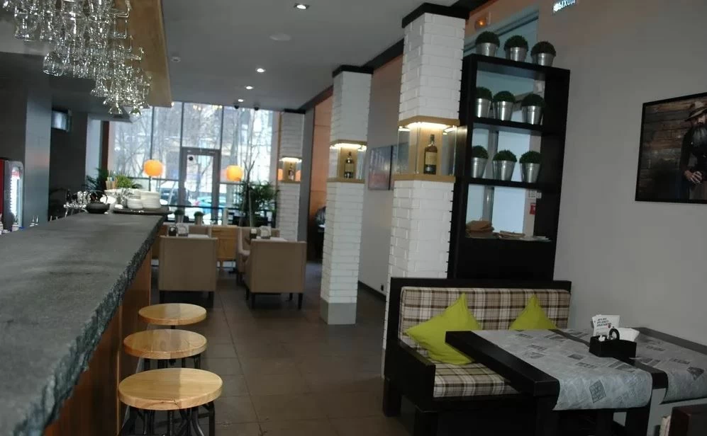 • Для создания в заведении уютной домашней атмосферы наши специалисты создали также черные шкафы со стеллажами открытых полок и деревянную интерьерную перегородку для удачного зонирования помещения.