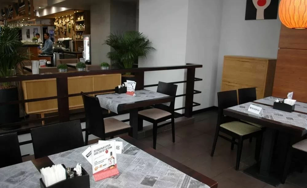 Для небольшого уютного зала Бара Котлета со стильными фигуративными обоями на стенах мебельная компания ТехноБар изготовила отличный комплект столовой мебели: