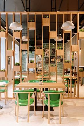 • А также множество стильных деревянных и металлических интерьерных решений для стен и потолка. Все они предназначены для украшения пространства кафе посредством искусного зонирования помещения. Некоторые из интерьерных перегородок служат также подставками для горшков с живыми цветами и растениями, придающими этому кафе атмосферу домашнего уюта!