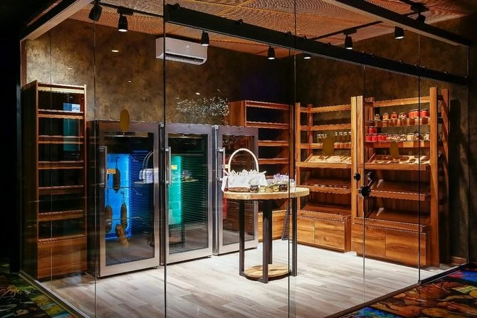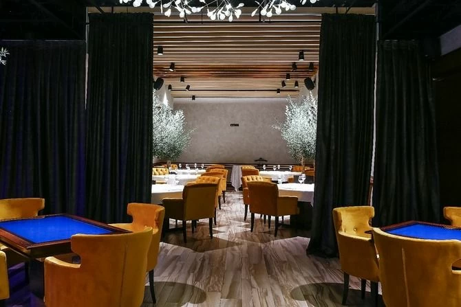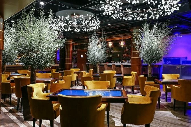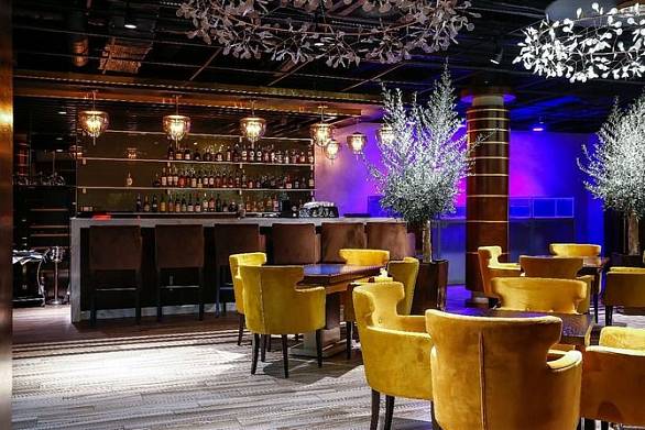 • Барную стойку с полками для напитков, окружённую мягкими барными стульями.